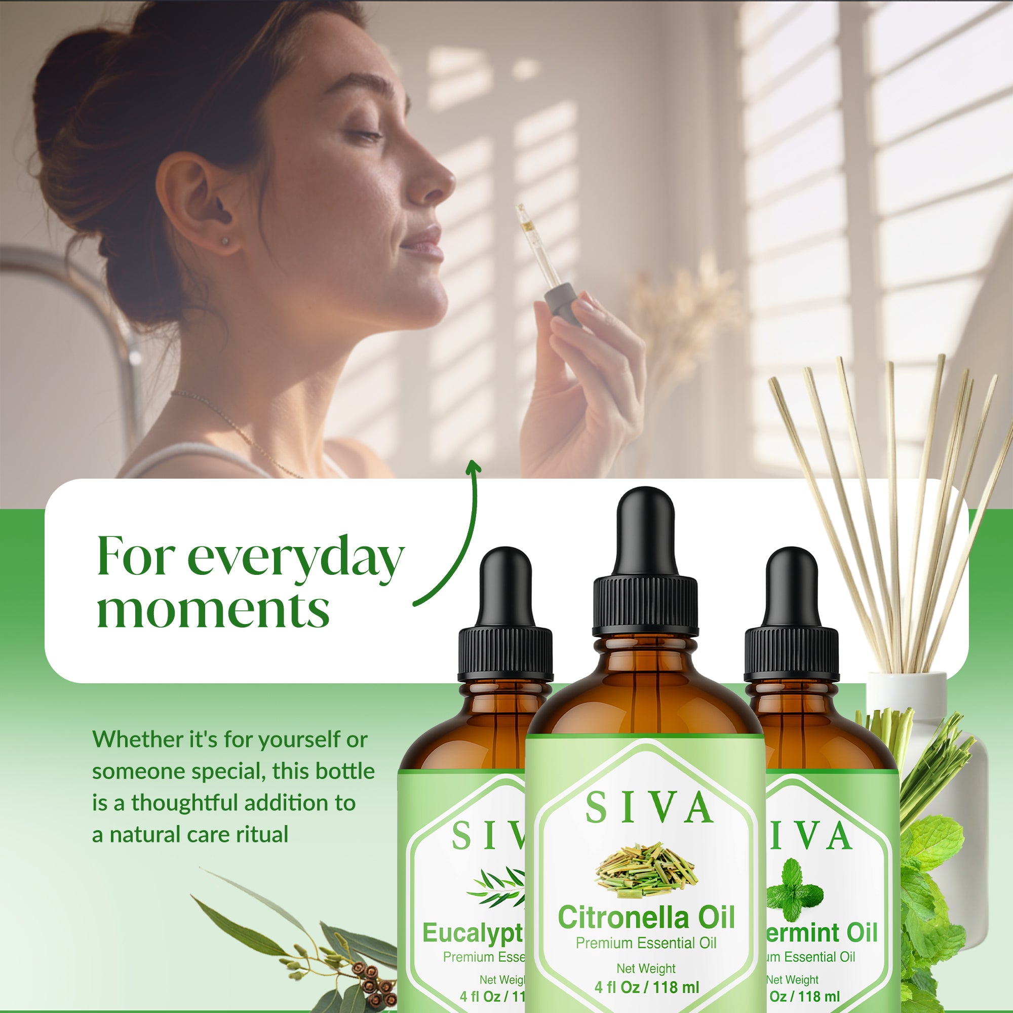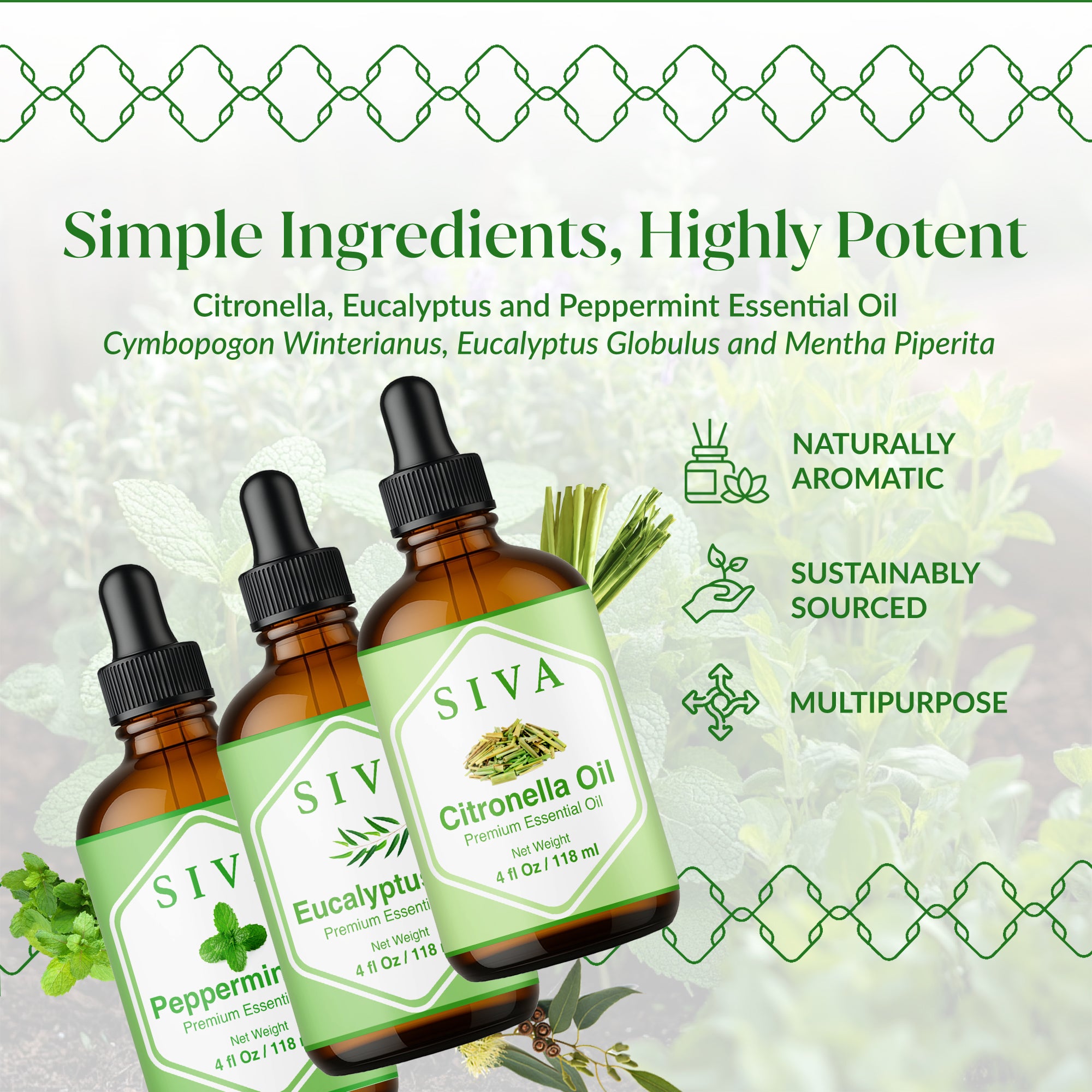SIVA Citronella, Eucalyptus and Peppermint Essential Oils 4 oz are 100% natural oils extracted from Cymbopogon Winterianus grass, Eucalyptus Globulus leaves, and Mentha Arvensis herb through steam distillation. SIVA Citronella Essential Oil is an essential oil and is obtained by steam distillation of Cymbopogon Winterianus grass. SIVA Eucalyptus Essential Oil is an essential oil and is obtained by steam distillation of Eucalyptus Globulus leaves. SIVA Peppermint Oil is obtained from the steam-distillation of the Mentha Arvensis herb. This Essential Oil starter kit is free from preservatives and vegan. These oils come with a convenient dropper for effortless application. Carefully created, it’s an excellent addition to your Essential Oil collection.
