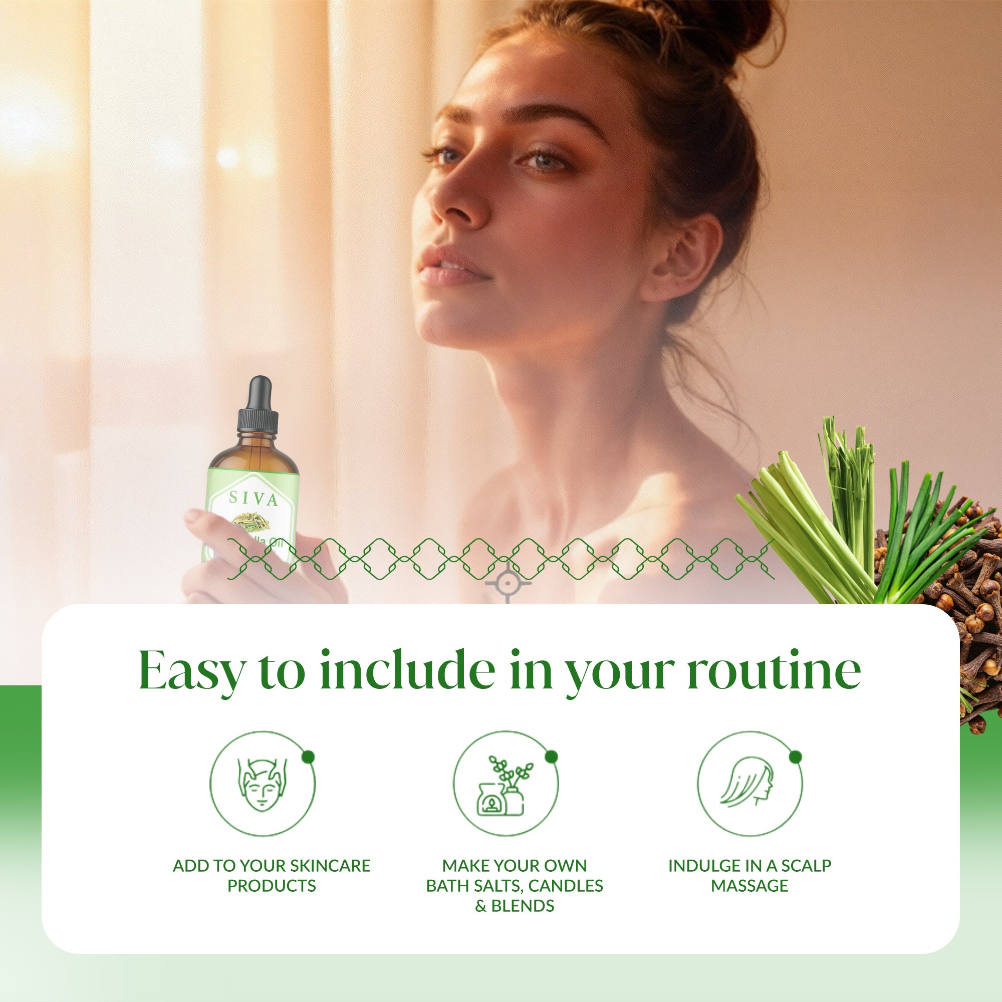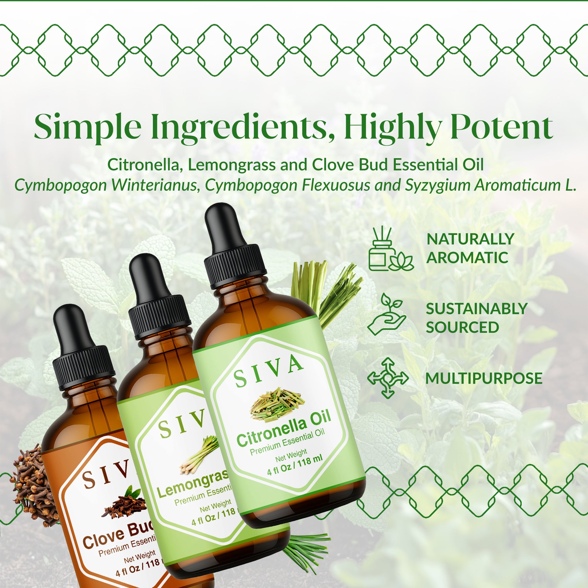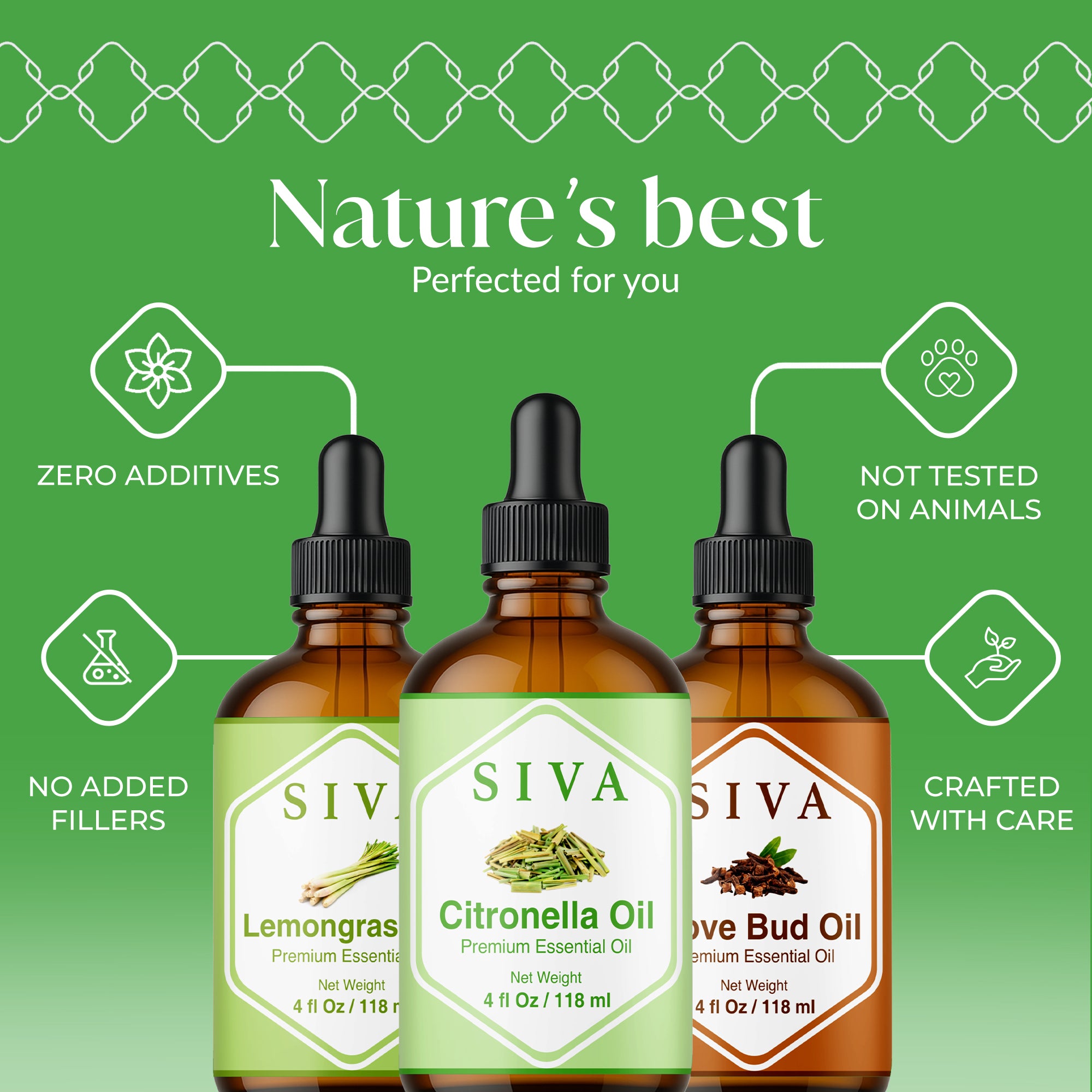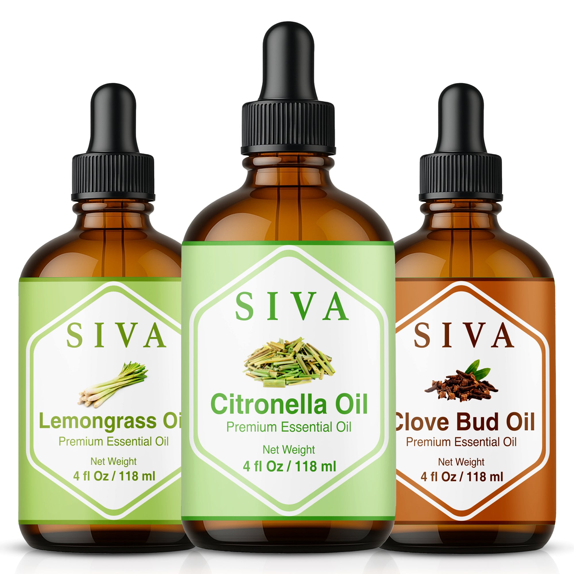SIVA Citronella, Lemongrass and Clove Bud Essential Oils 4 oz are 100% natural oils extracted from Cymbopogon Winterianus grass, Cymbopogon flexuosus leaves and Syzygium aromaticum L. buds through steam distillation. SIVA Citronella Essential Oil is an essential oil and is obtained by steam distillation of Cymbopogon Winterianus grass. SIVA Lemongrass essential oil is obtained by steam distillation of Cymbopogon flexuosus leaves. SIVA Clove Bud Oil essential oil is obtained by steam distillation of Syzygium aromaticum L. bud. This Essential Oil starter kit is free from preservatives and 100% vegan. These oils come with a convenient dropper for effortless application. Carefully created, it’s an excellent addition to your Essential Oil collection.