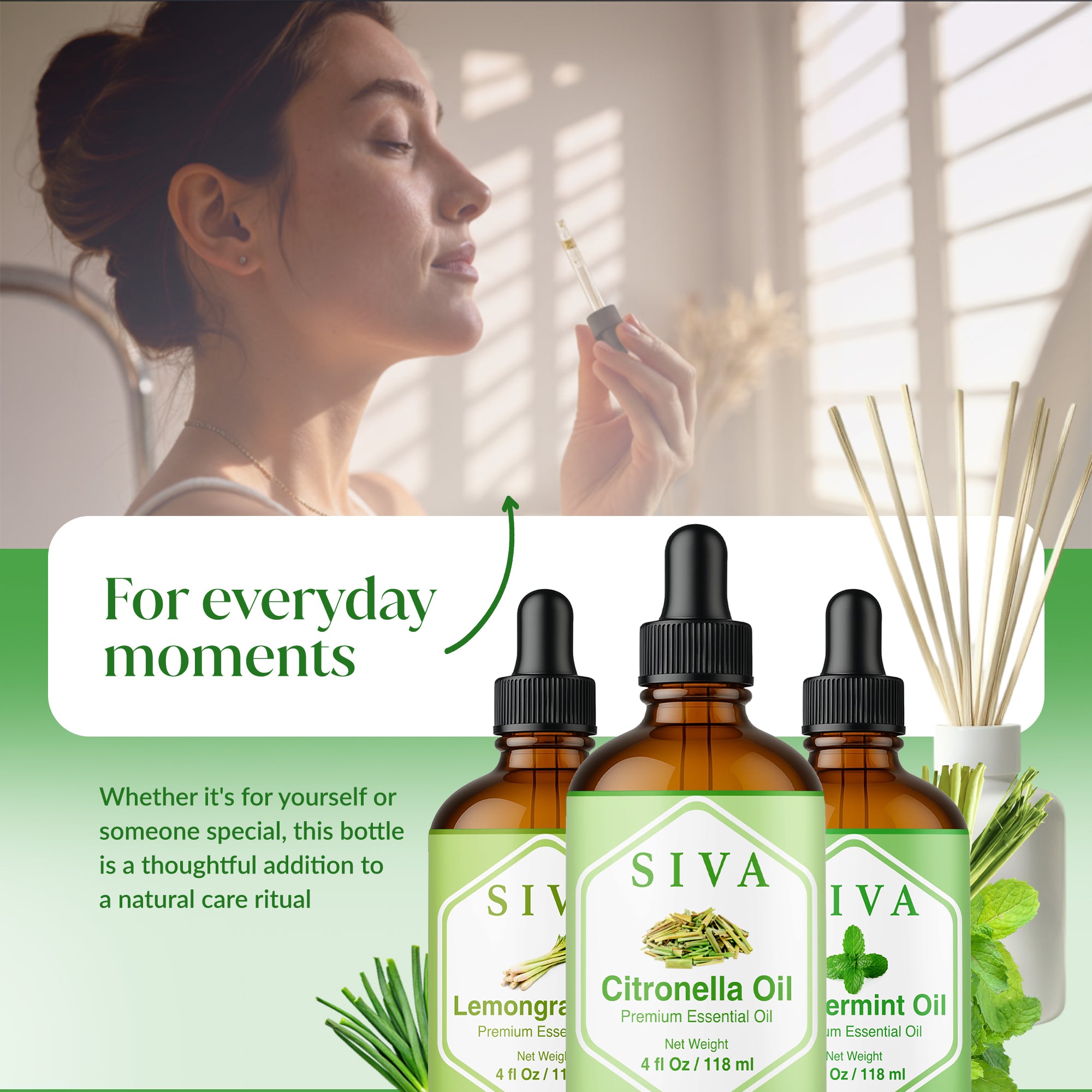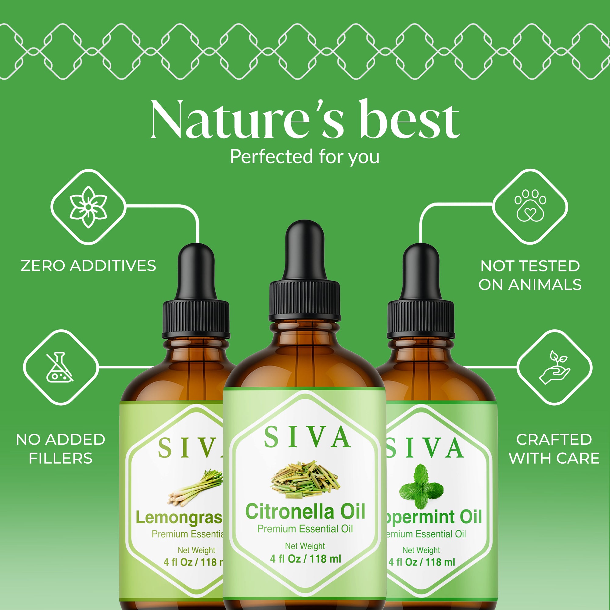 SIVA Citronella, Lemongrass and Peppermint Essential Oils 4 oz are 100% natural oils extracted from Cymbopogon Winterianus grass, Cymbopogon flexuosus leaves and Mentha Arvensis herb through steam distillation. SIVA Citronella Essential Oil is an essential oil and is obtained by steam distillation of Cymbopogon Winterianus grass. SIVA Lemongrass essential oil is obtained by steam distillation of Cymbopogon flexuosus leaves. SIVA Peppermint Oil is obtained from the steam-distillation of the Mentha Arvensis herb. This Essential Oil starter kit is free from preservatives and 100% vegan. These oils come with a convenient dropper for effortless application. Carefully created, it’s an excellent addition to your Essential Oil collection.