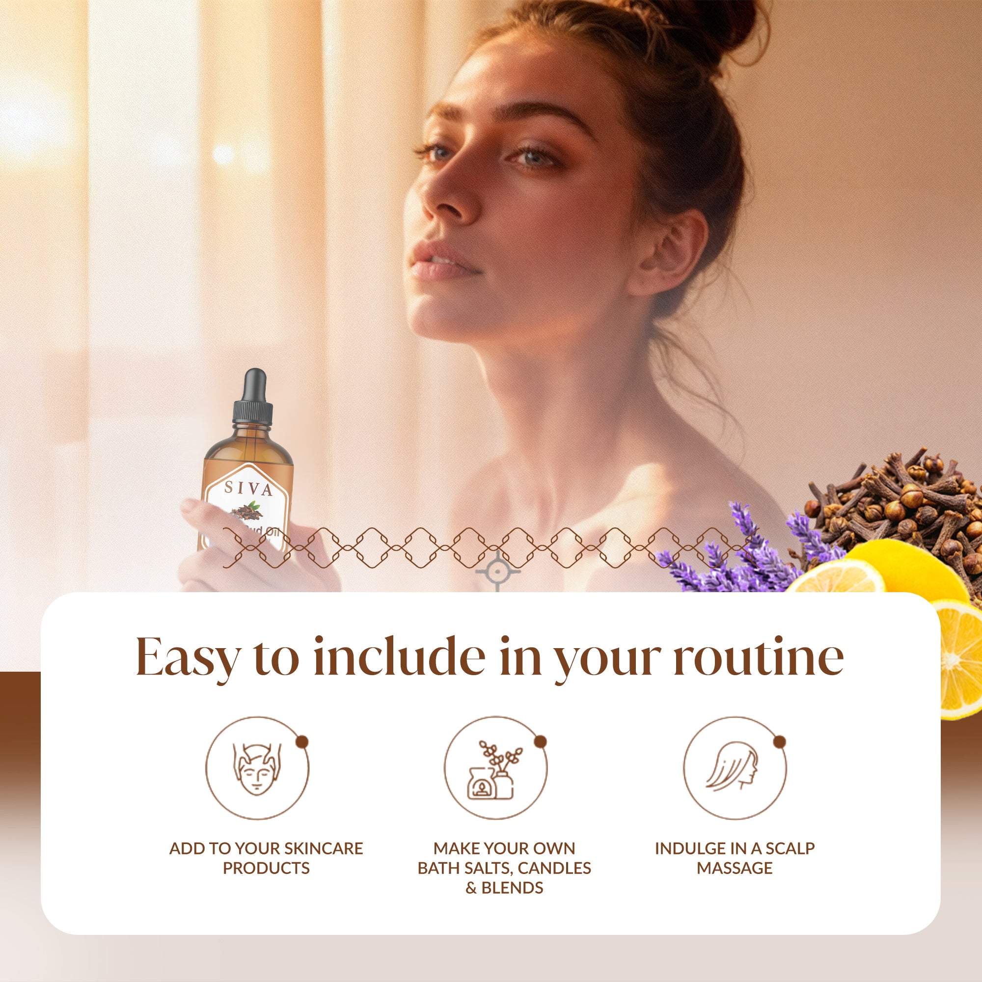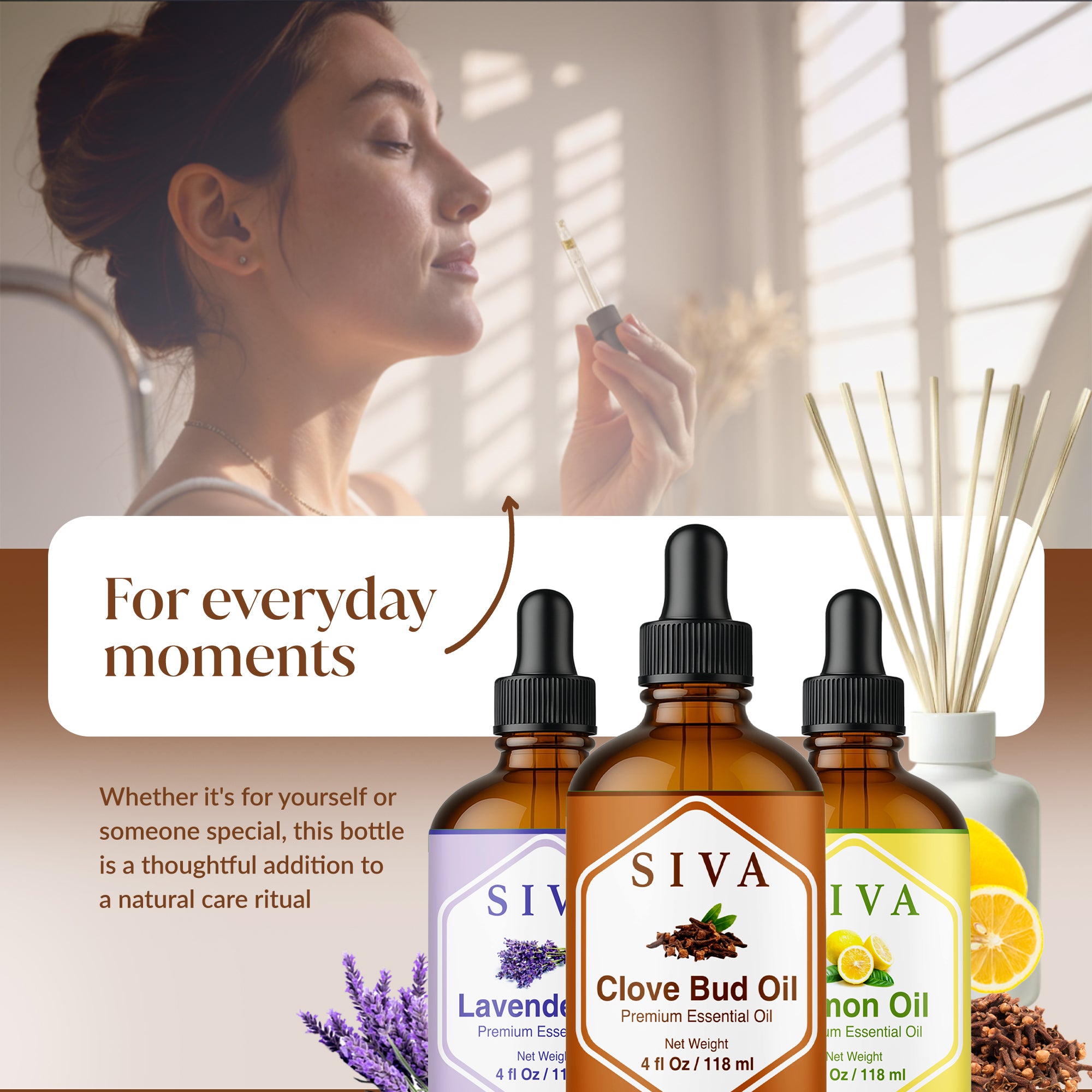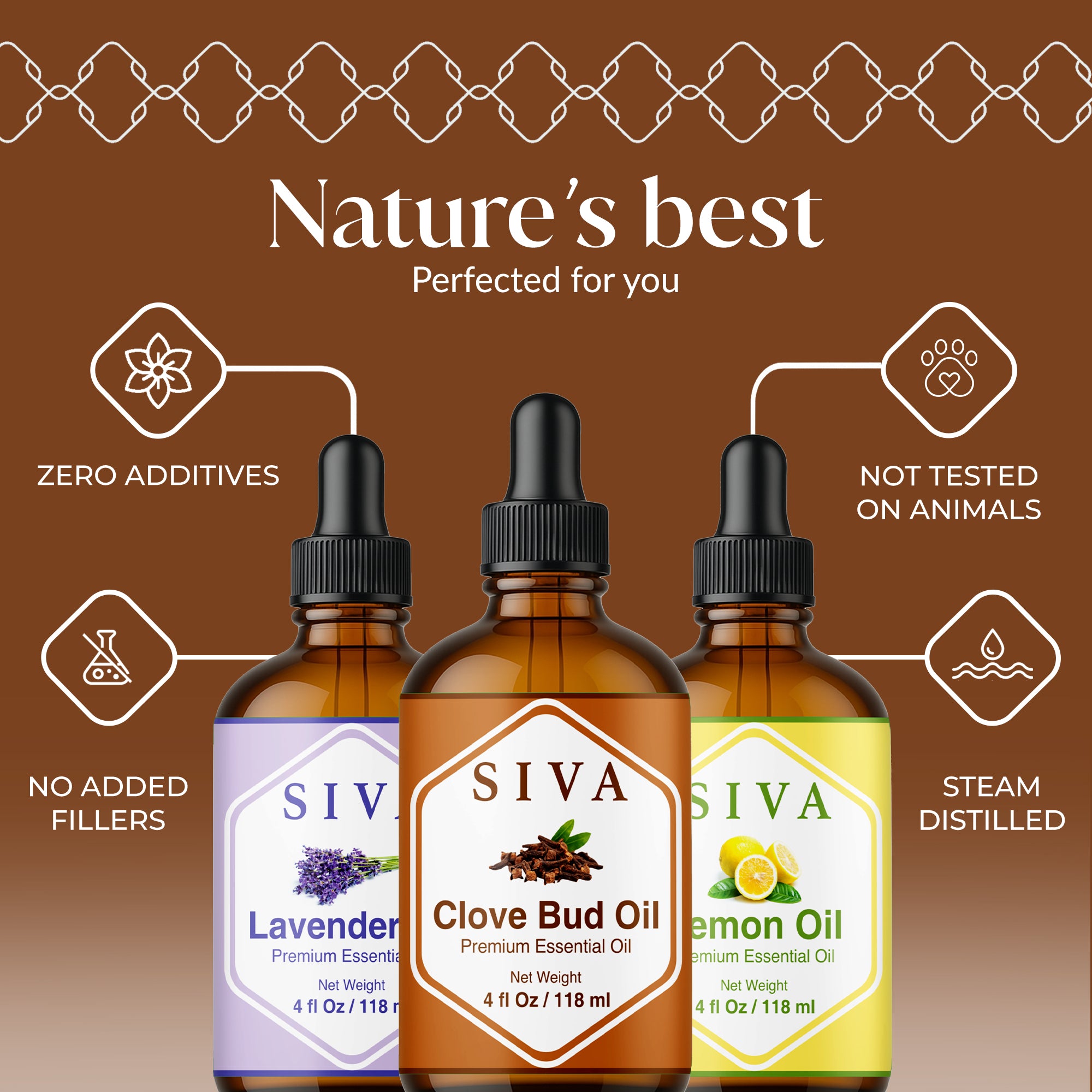 SIVA Clove Bud, Lemon and Lavender Essential Oils 4 oz are 100% natural oils extracted from Syzygium aromaticum L. buds (steam distillation), Citrus Limon Fruit Peel (Cold-pressed) and Lavandula Angustifolia flowers (steam distillation). SIVA Clove Bud Oil essential oil is obtained by steam distillation of Syzygium aromaticum L. bud. SIVA Lemon Essential Oil is an essential oil and is obtained by cold-pressed extraction of Citrus Limon Fruit Peel. SIVA Lavender Oil is a premium essential oil and is obtained by steam distillation of Lavandula Angustifolia flowers. This Essential Oil starter kit is free from preservatives and 100% vegan. These oils come with a convenient dropper for effortless application. Carefully created, it’s an excellent addition to your Essential Oil collection.