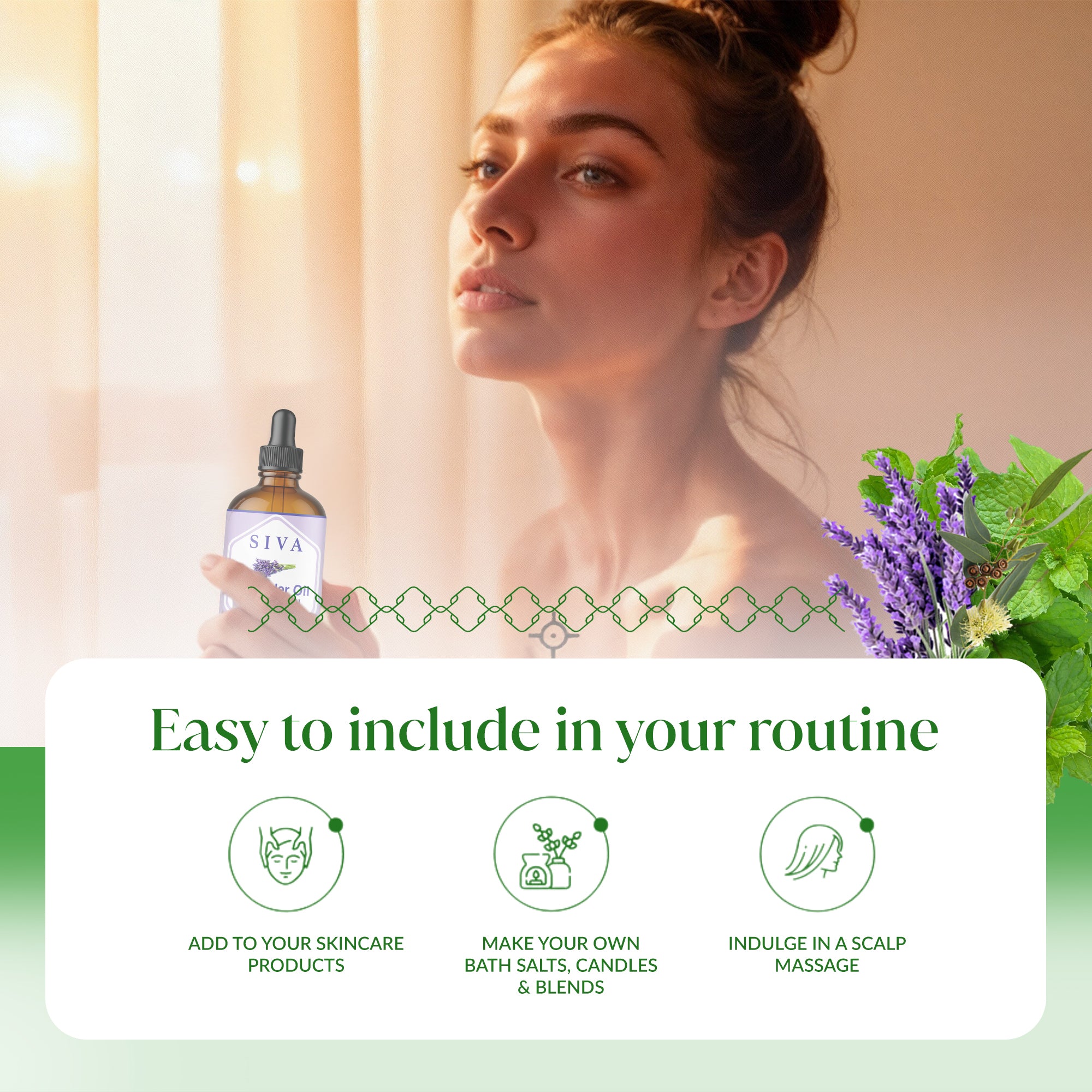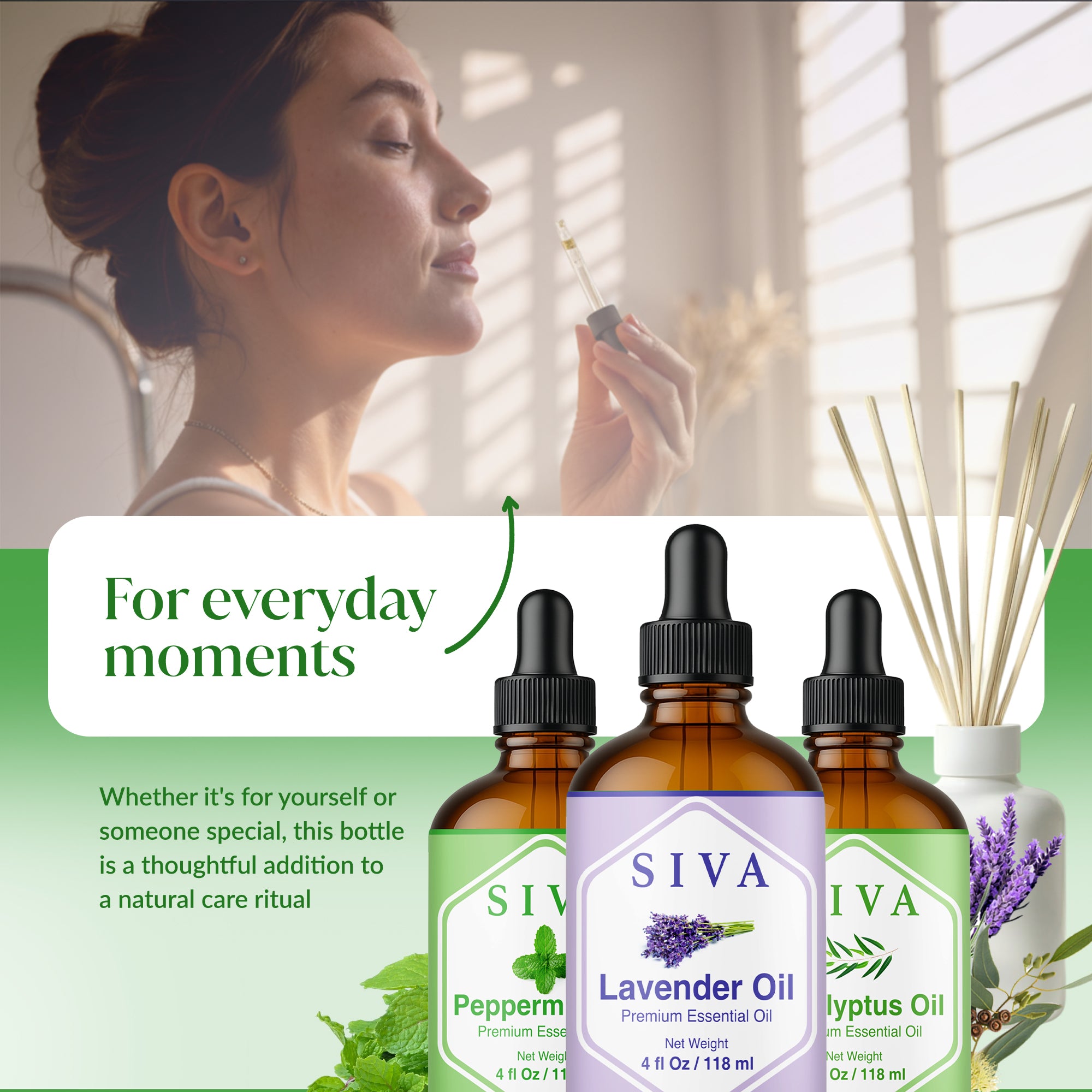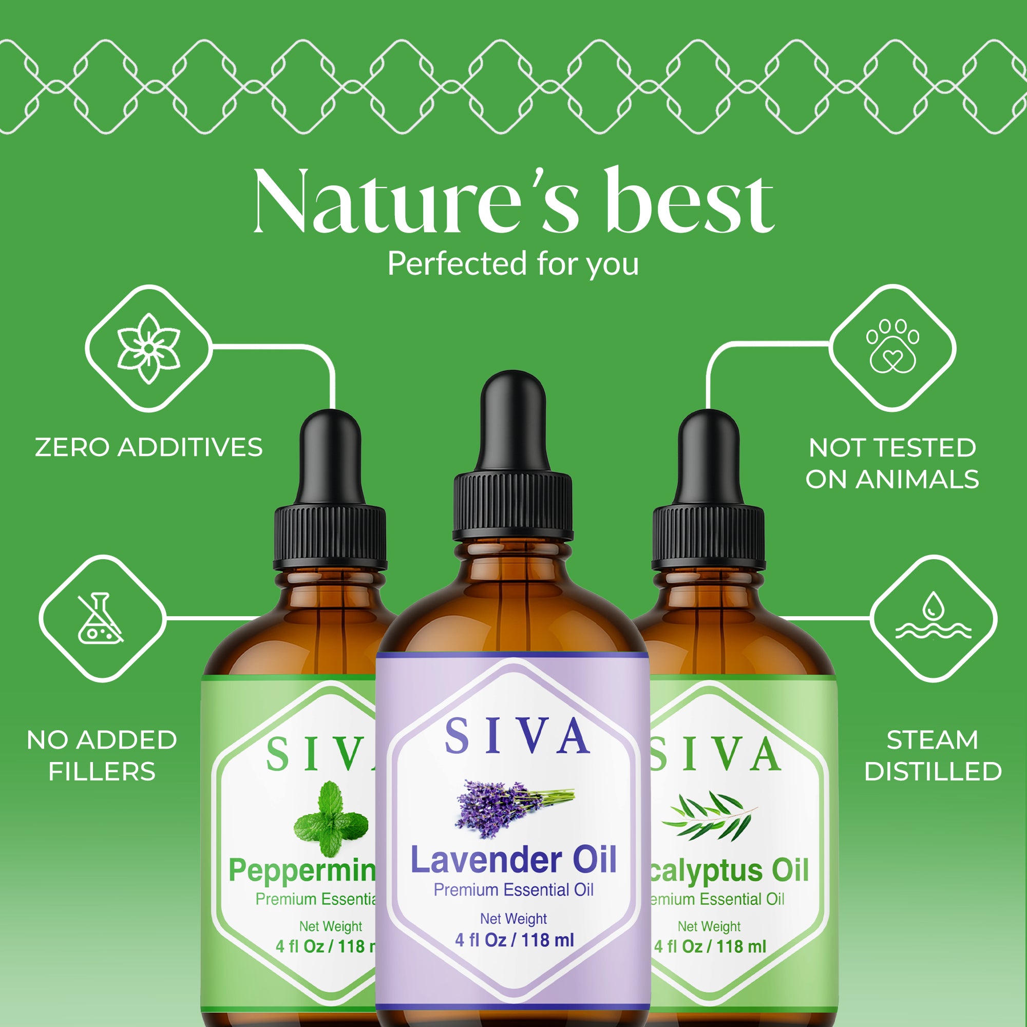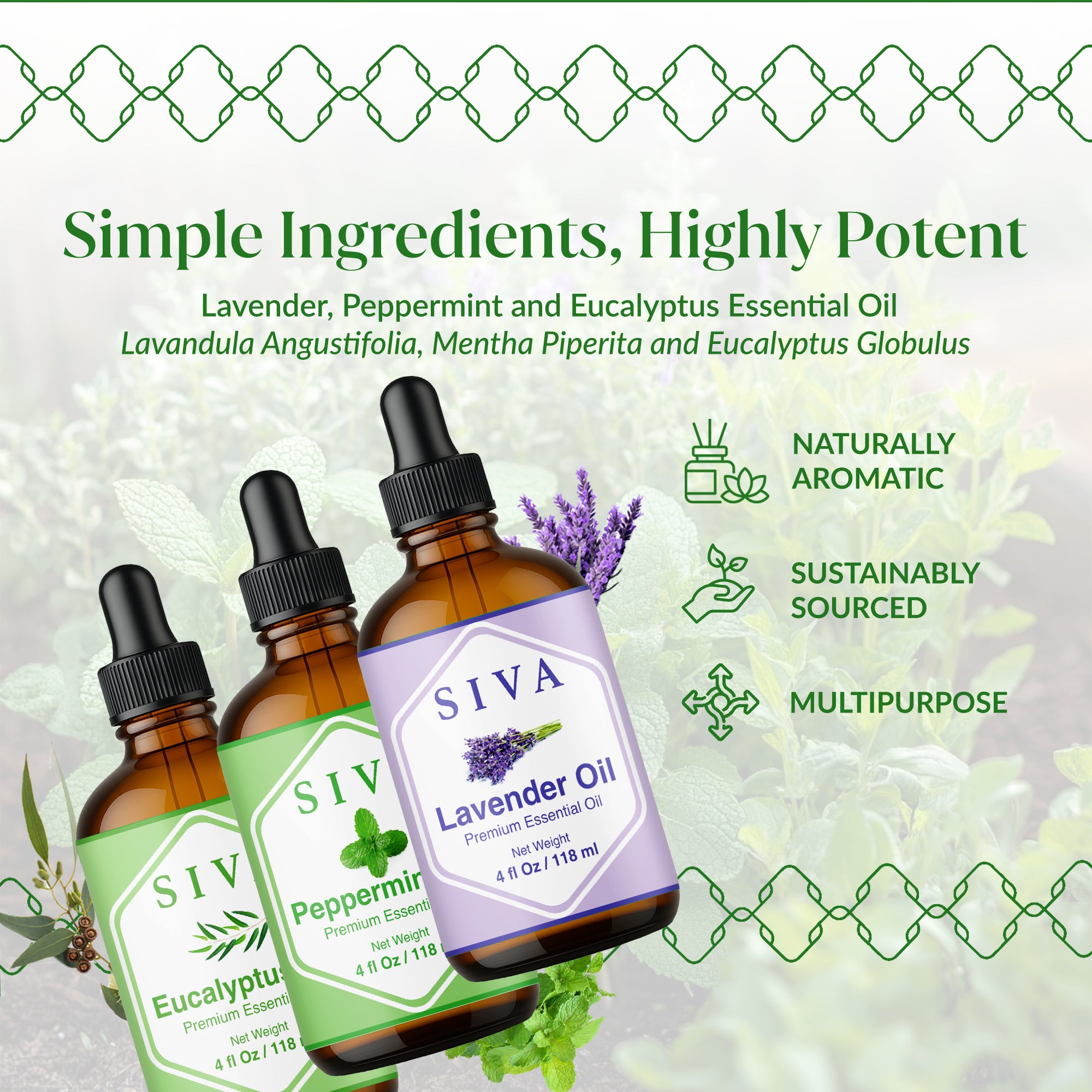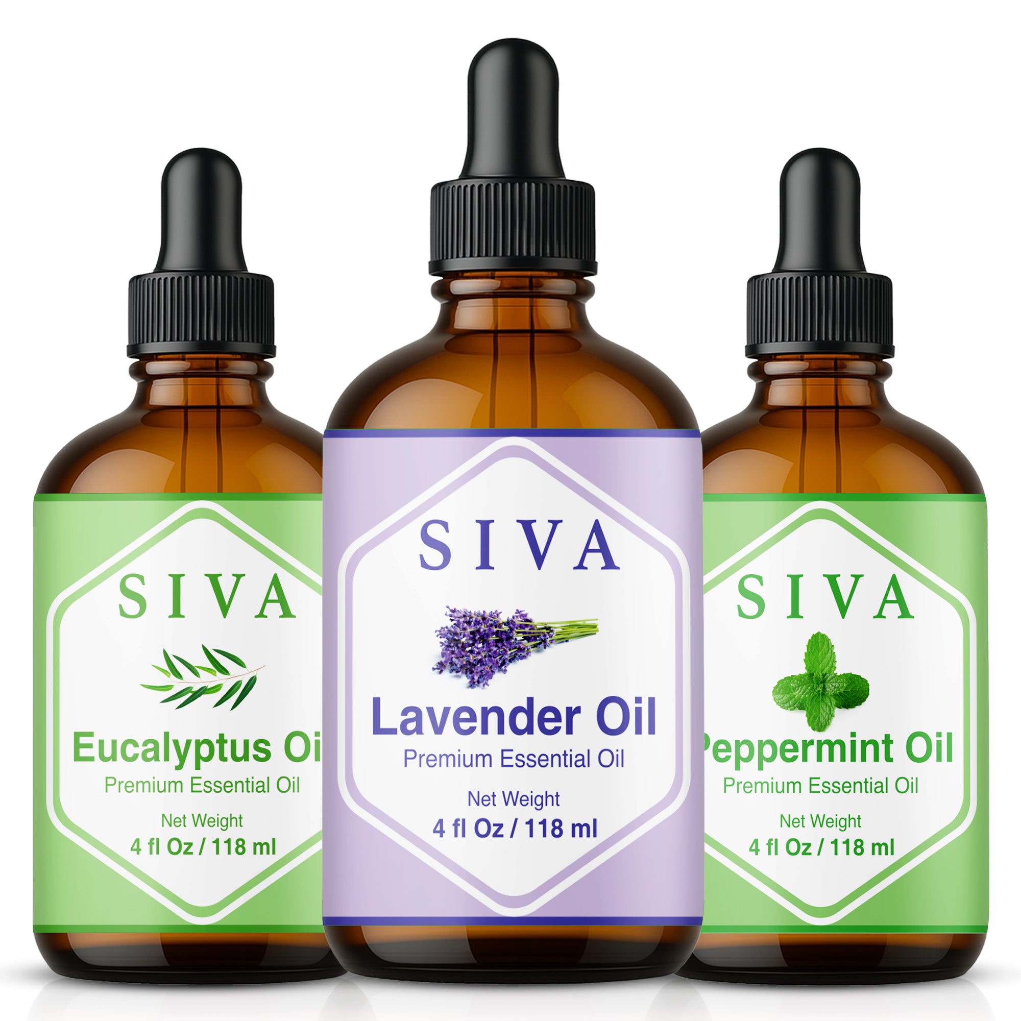 SIVA Lavender, Peppermint and Eucalyptus Essential Oils 4 oz are 100% natural oils extracted from Lavandula Angustifolia flowers, Mentha Arvensis herb, and Eucalyptus Globulus leaves through steam distillation. SIVA Lavender Oil is a premium essential oil and is obtained by steam distillation of Lavandula Angustifolia flowers. SIVA Peppermint Oil is obtained from the steam-distillation of the Mentha Arvensis herb. SIVA Eucalyptus oil is obtained by steam distillation of Eucalyptus Globulus leaves. This Essential Oil starter kit is free from preservatives and 100% vegan. These oils come with a convenient dropper for effortless application. Carefully created, it’s an excellent addition to your Essential Oil collection.