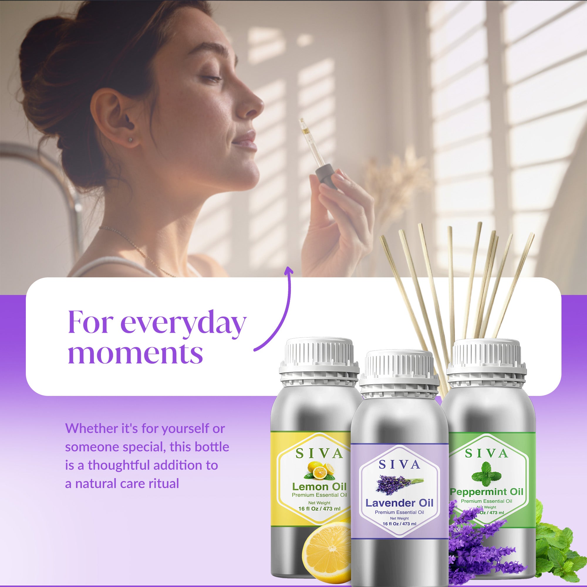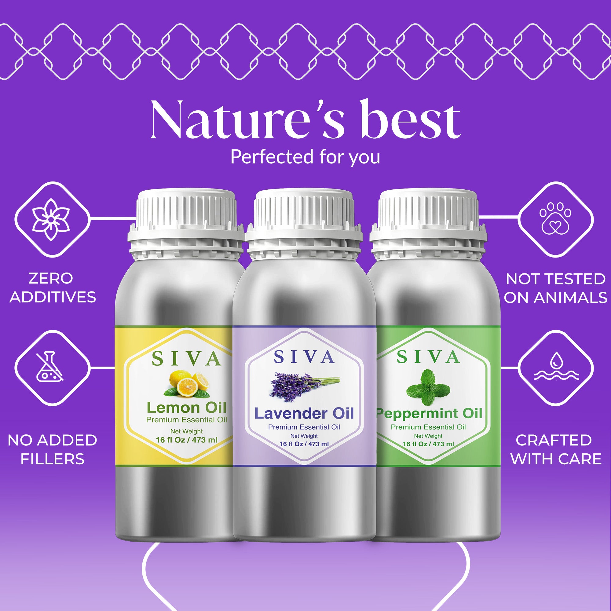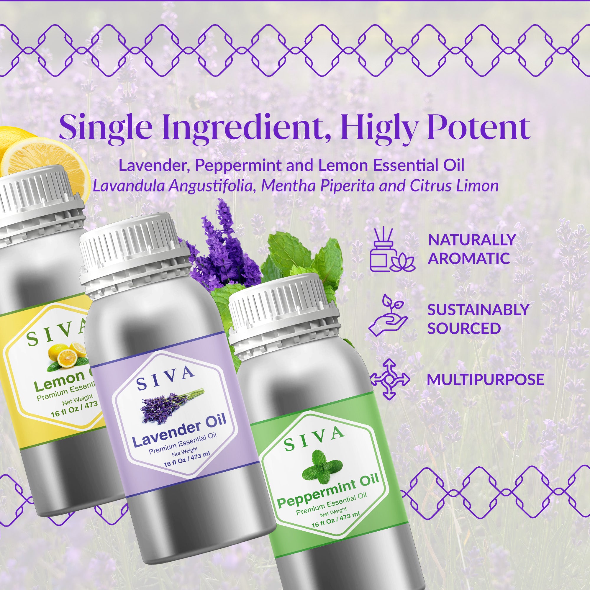 SIVA Lavender, Lemon and Peppermint Essential Oils 16 oz are 100% natural oils extracted from Lavandula Angustifolia flowers (steam distillation), Citrus Limon Fruit Peel (Cold-pressed) and Mentha Arvensis herb (steam distillation). SIVA Lavender Oil is a premium essential oil and is obtained by steam distillation of Lavandula Angustifolia flowers. SIVA Lemon Essential Oil is an essential oil and is obtained by cold-pressed extraction of Citrus Limon Fruit Peel. SIVA Peppermint Oil is obtained from the steam-distillation of the Mentha Arvensis herb. This Essential Oil starter kit is free from preservatives and 100% vegan. These oils come with a convenient dropper for effortless application. Carefully created, it’s an excellent addition to your Essential Oil collection.