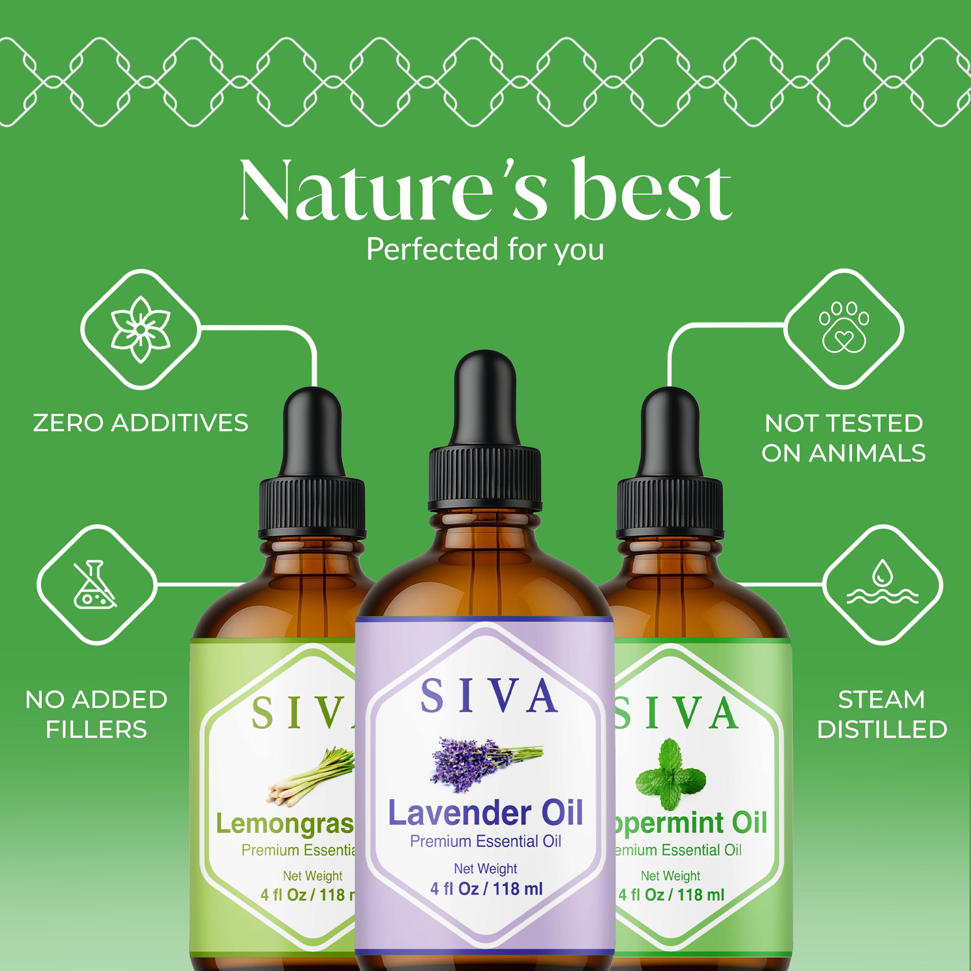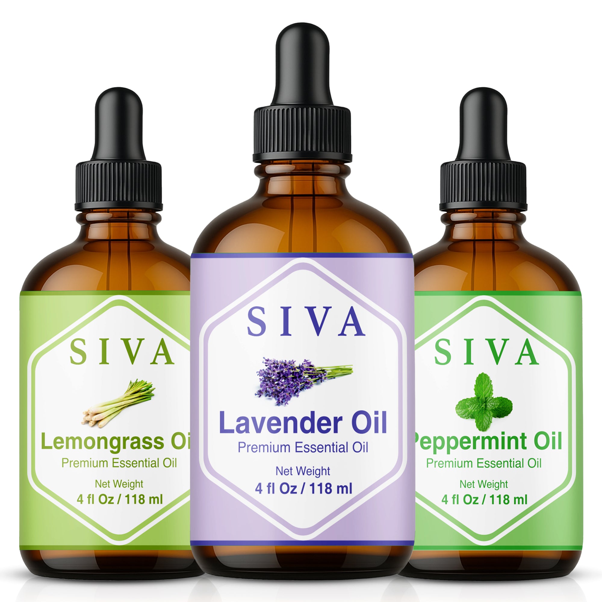 SIVA Lavender, Peppermint and Lemongrass Essential Oils 4 oz are 100% natural oils extracted from Lavandula Angustifolia flowers, Mentha Arvensis herb and Cymbopogon flexuosus leaves through steam distillation. SIVA Lavender Oil is a premium essential oil and is obtained by steam distillation of Lavandula Angustifolia flowers. SIVA Peppermint Oil is obtained from the steam-distillation of the Mentha Arvensis herb. SIVA Lemongrass essential oil is obtained by steam distillation of Cymbopogon flexuosus leaves. This Essential Oil starter kit is free from preservatives and 100% vegan. These oils come with a convenient dropper for effortless application. Carefully created, it’s an excellent addition to your Essential Oil collection.