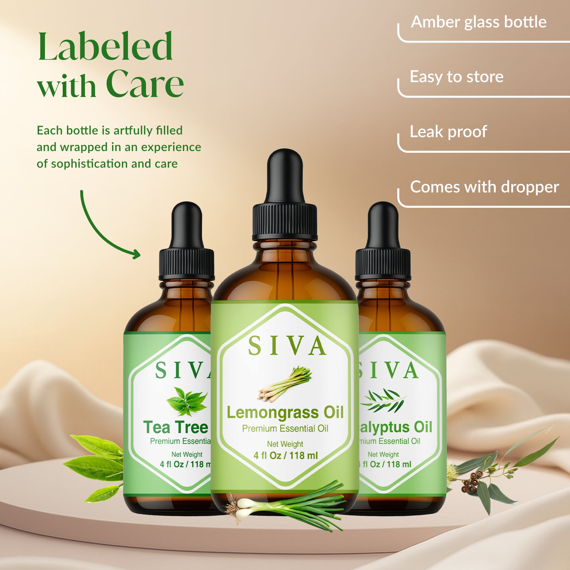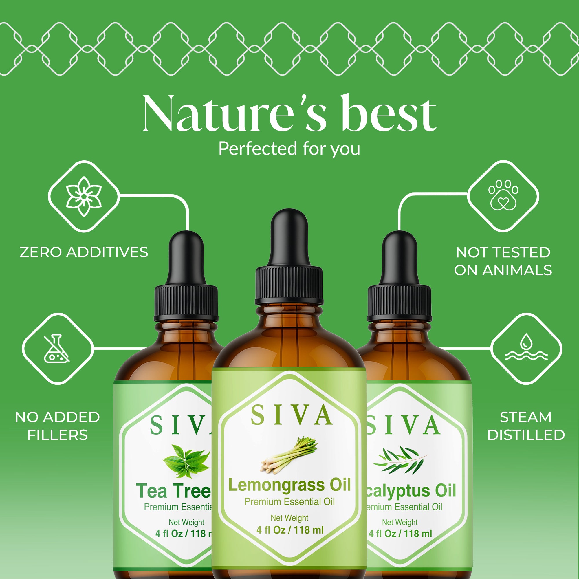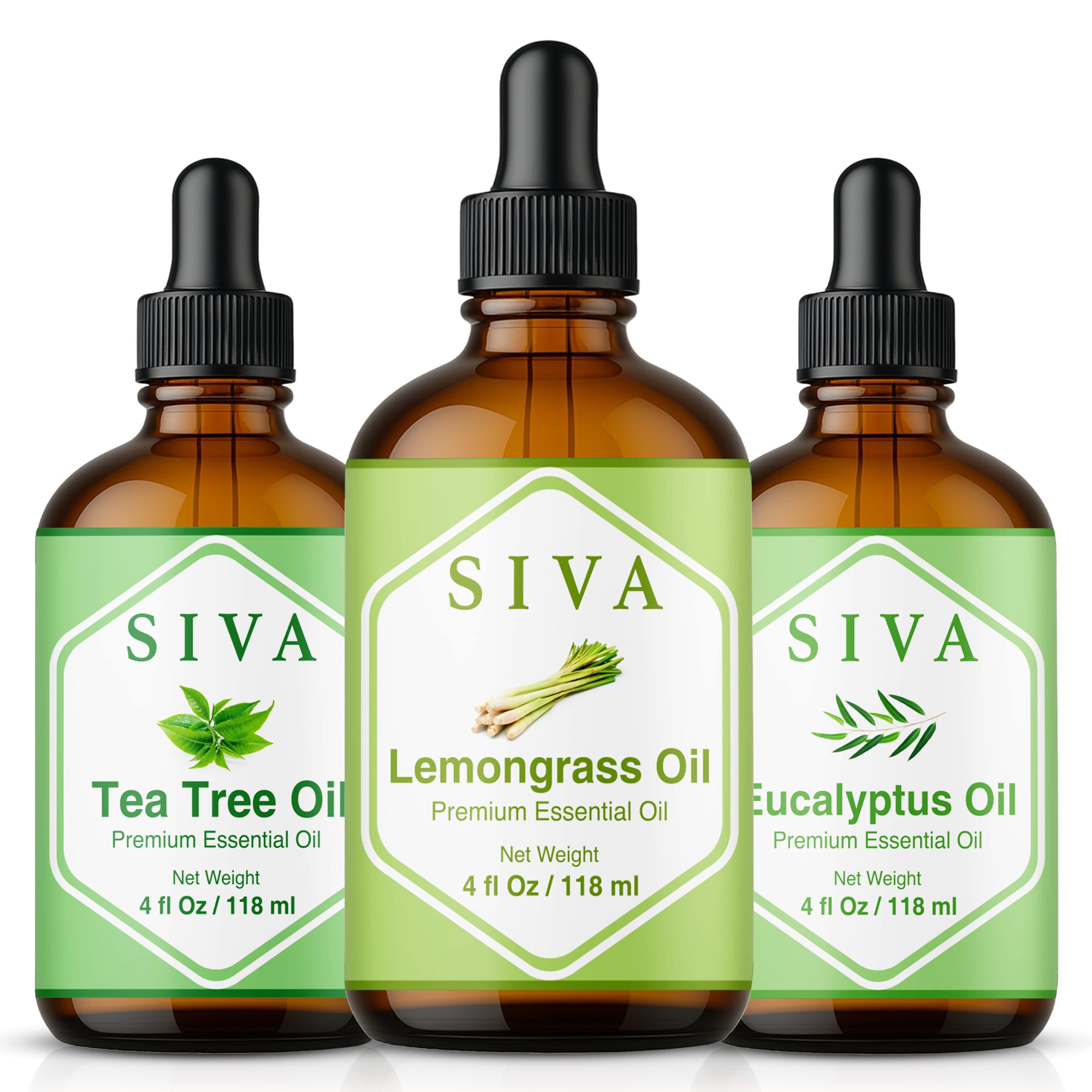 SIVA Lemongrass, Tea Tree and Eucalyptus Essential Oils 4 oz are 100% natural oils extracted from Cymbopogon flexuous leaves, Melaleuca Alternifolia leaves and Eucalyptus Globulus leaves through steam distillation. SIVA Lemongrass essential oil is obtained by steam distillation of Cymbopogon flexuous leaves. SIVA Tea Tree Oil is an essential oil and is obtained by steam distillation of Melaleuca Alternifolia leaves. SIVA Eucalyptus Essential Oil is an essential oil and is obtained by steam distillation of Eucalyptus Globulus leaves. This Essential Oil starter kit is free from preservatives and 100% vegan. These oils come with a convenient dropper for effortless application. Carefully created, it’s an excellent addition to your Essential Oil collection.